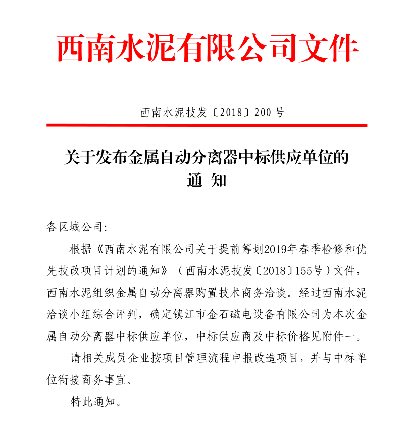 鎮(zhèn)江市金石磁電設(shè)備有限公司中標(biāo)